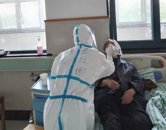 觀察患者病情,配合醫(yī)生治療,照顧患者的生活起居……是盛紅娜在隔離病房的主要護(hù)理工作。5月4日晚,盛紅娜正準(zhǔn)備下班,當(dāng)?shù)弥綦x病房?jī)?nèi)一位89歲的老人疑似心梗,需要護(hù)理人員24小時(shí)特護(hù)時(shí),“我來(lái)!”盛紅娜毫不猶豫“接班”,這一天,她持續(xù)工作了9個(gè)小時(shí)。