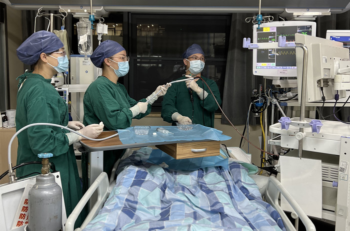 ICU接診醫(yī)師馮興林立即啟動氣道急癥快速診治流程,氣道急癥快速通道診治團(tuán)隊人員接到預(yù)警后,迅速趕到,在ICU床旁為吳爺爺施行“支氣管鏡下氣道血栓清理”。