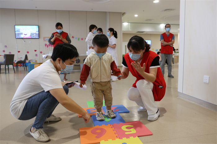 “哇,寶貝真棒!”“很開心!”兒科病房活動(dòng)區(qū),小朋友正在家長的陪伴下玩起了“跳格子”。