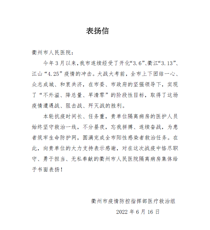 日前,我院收到了一封來自衢州市疫情防控指揮部醫(yī)療救治組的感謝信,為我院在此次疫情大考中忘我拼搏、主動擔(dān)當(dāng)?shù)木珰馍顸c(diǎn)贊。