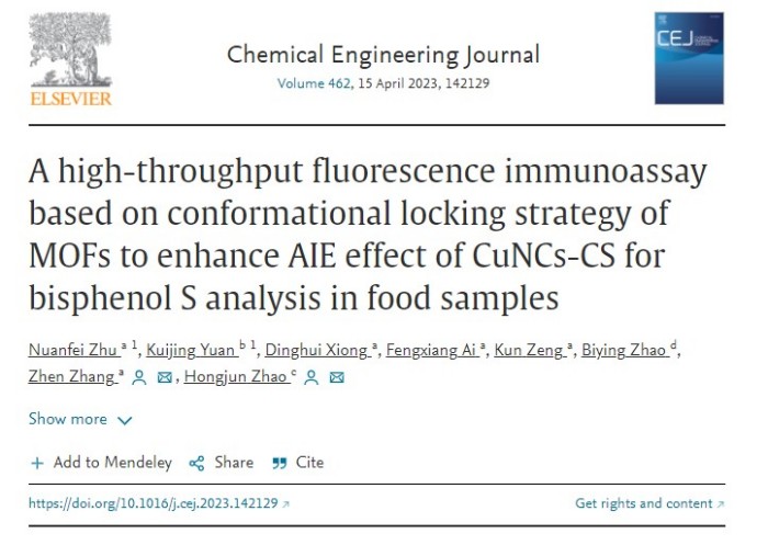 日前,我院藥物臨床試驗機構辦公室副主任趙紅軍博士,以通訊作者在國際知名期刊Chemical Engineering Journal上發(fā)表題為《基于MOFs構象鎖定策略增強銅納米簇AIE效應構建超靈敏雙酚S熒光免疫分析法用于食品中新污染物的污染調查與人體健康風險評估》的研究論文。