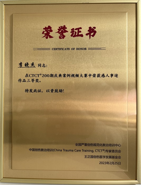 日前,由全國嚴重創(chuàng)傷規(guī)范化救治培訓中心等機構主辦的“CTCT?200期慶典案例視頻大賽”中,我院EICU護士李曉杰榮獲“感人事跡作品三等獎”。