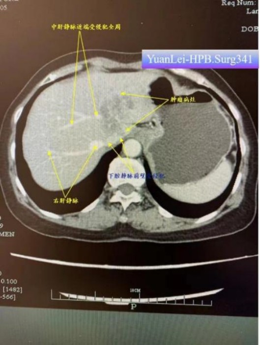 來自衢州市龍游縣68歲的藍(lán)阿姨,因腹痛去醫(yī)院檢查,診斷為左肝及尾狀葉肝內(nèi)膽管癌,侵犯中肝靜脈近端主干360度、侵犯下腔靜脈。因手術(shù)風(fēng)險大,從當(dāng)?shù)蒯t(yī)院慕名轉(zhuǎn)入袁磊團(tuán)隊進(jìn)行手術(shù),袁磊組織團(tuán)隊進(jìn)行術(shù)前討論,制定了詳細(xì)的手術(shù)方案和風(fēng)險防范措施,術(shù)前即擬定了全肝血流阻斷方案。術(shù)中在下腔靜脈受侵的部位處理時,憑借高超的手術(shù)技術(shù)和過人膽識,袁磊果斷實施全肝血流阻斷,切除受侵部分下腔靜脈前壁,從容修補(bǔ)靜脈壁缺損,成功完成了解剖性肝左三葉+全尾葉切除術(shù)+下腔靜脈壁修補(bǔ)+區(qū)域淋巴結(jié)清掃+膽囊切除術(shù)。