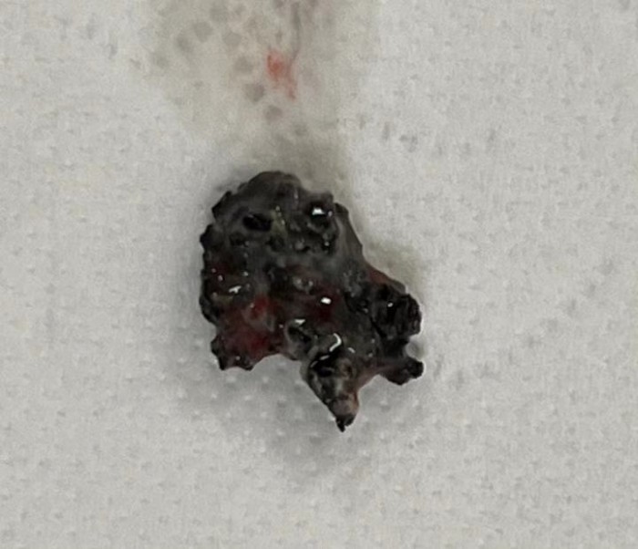 CT結(jié)果提示:右肺及左肺下葉多發(fā)感染灶,右肺中葉肺不張。為進(jìn)一步明確診斷,呼吸與危重癥醫(yī)學(xué)科姜建洋主任醫(yī)師為黃老伯行氣管鏡檢查,發(fā)現(xiàn)患者右中間支氣管有一塊黑色結(jié)石,就是這塊“小腹黑”堵塞了管腔,導(dǎo)致周圍粘膜充血、水腫,肉芽增生,管腔重度狹窄。