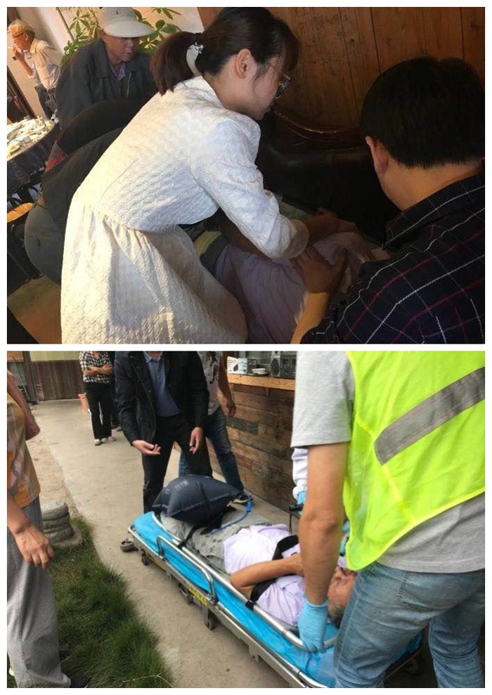 ??? 王昊婧看到一桌子人圍著一名年近60的男子,他癱坐在椅子上,雙目緊閉、臉色蒼白,口角還有嘔吐物。王昊婧立即讓周圍人幫忙把男子放平,將他的頭部偏向一側,以防出現窒息。