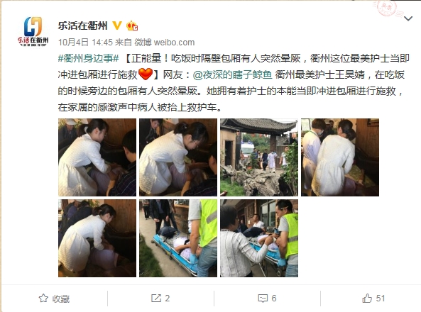 ??? 10月4日下午,市區(qū)一飯店上演了暖人心的一幕:隔壁包廂一位男顧客突發(fā)疾病,失去意識,我院美小護第一時間沖上前去,積極施救。此事被網友紛紛點贊。