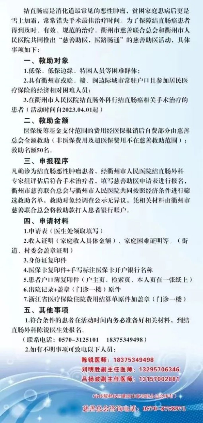 今年,衢州市慈善聯(lián)合總會與衢州市人民醫(yī)院共同推出“慈善助醫(yī),‘醫(yī)’路‘腸’通”活動,專門為困難患者提供幫助。