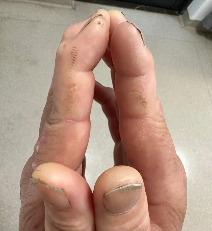 表現(xiàn)為手指的掌面和側(cè)面皮膚過(guò)多角化、裂紋及粗糙,類(lèi)似于長(zhǎng)期從事手工作業(yè)的技術(shù)工人手,故名“技工手”。還可出現(xiàn)足跟部的表皮增厚、粗糙和過(guò)度角化,又稱(chēng)為“技工足”。