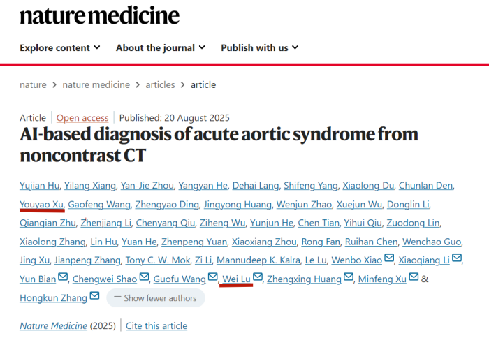 日前,全球頂尖醫(yī)學期刊《Nature Medicine》在線發(fā)表了一項關于急性主動脈綜合征(AAS)人工智能診斷的重要研究成果——《AI-based diagnosis of acute aortic syndrome from noncontrast CT》。我院血管外科作為核心參與單位之一,黨委委員、副院長陸煒作為共同通訊作者,為本研究提供了重要臨床數(shù)據(jù)與技術支持。