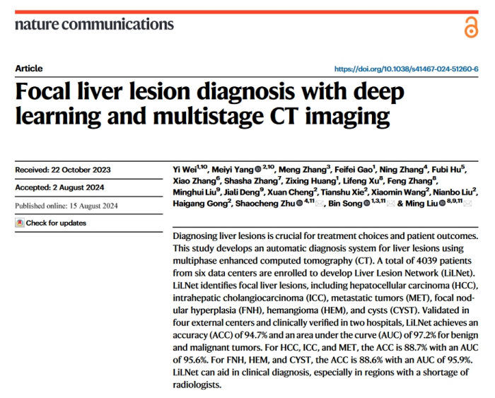 衢州市人民醫(yī)院(溫州醫(yī)科大學(xué)附屬衢州醫(yī)院)醫(yī)學(xué)人工智能診斷與預(yù)后技術(shù)研發(fā)重點(diǎn)實(shí)驗(yàn)室科研團(tuán)隊(duì)聯(lián)合四川大學(xué)華西醫(yī)院宋彬教授團(tuán)隊(duì)、河南省人民醫(yī)院朱紹成教授團(tuán)隊(duì)完成的研究成果《Focal liver lesion diagnosis with deep learning and multistage CT imaging(基于深度學(xué)習(xí)和多階段CT成像的肝臟局灶性病變診斷)》成功發(fā)表在《Nature Communications》期刊上!該論文于2024年8月15日正式在線發(fā)表,是我院以通訊作者在《Nature》子刊上發(fā)表的首篇論文。