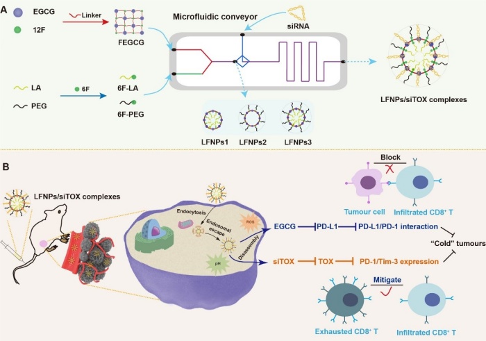 免疫檢查點(diǎn)抑制劑(Immune checkpoint inhibitors, ICIs)的應(yīng)用,為癌癥治療提供了一種變革性的治療手段。ICIs能夠通過靶向細(xì)胞程序性死亡蛋白1及其配體1(PD-1/PD-L1)通路,激活免疫系統(tǒng)而有效地抑制腫瘤發(fā)展。然而,T細(xì)胞耗竭仍然是限制ICIs治療效果的主要瓶頸,研究團(tuán)隊(duì)基于茶多酚EGCG為底物,通過微流控技術(shù)構(gòu)建了新型siRNA納米遞送體系。其中,LFNPs3-3/siTOX納米復(fù)合物具備最優(yōu)越的siRNA遞送效率。研究表明,其可以有效降低腫瘤細(xì)胞PD-L1的表達(dá),并逆轉(zhuǎn)CD8+T細(xì)胞的耗竭,最終激發(fā)機(jī)體產(chǎn)生強(qiáng)大的免疫能力。