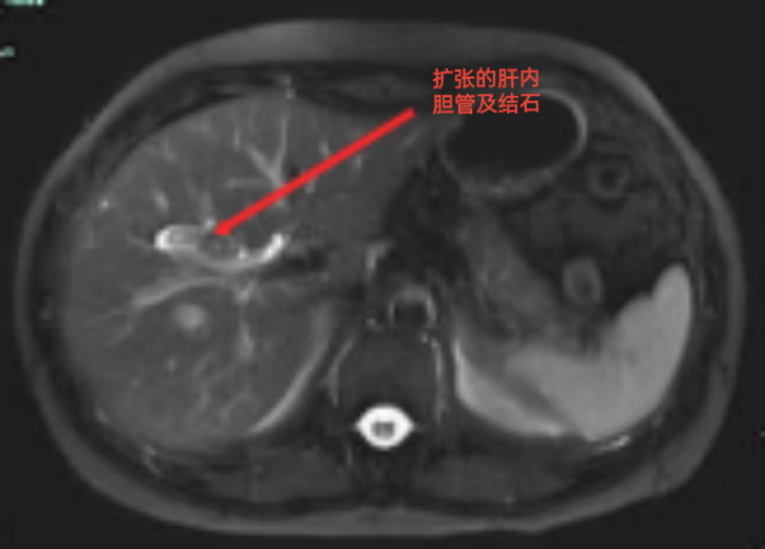 經(jīng)上腹部磁共振增強掃描,余女士被明確診斷為“膽囊結(jié)石;右肝內(nèi)膽管結(jié)石伴膽管擴張;右肝小囊腫?!?