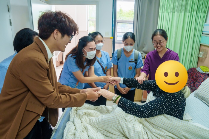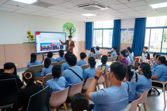 隨后,師生們參觀老年醫(yī)學(xué)科病房,與患者親切互動(dòng)。88歲的胡爺爺(化名)分享道,住院十余天來(lái),醫(yī)護(hù)團(tuán)隊(duì)的精心照護(hù)讓他從臥床狀態(tài)恢復(fù)到能在院區(qū)散步,感受到家人般的溫暖。