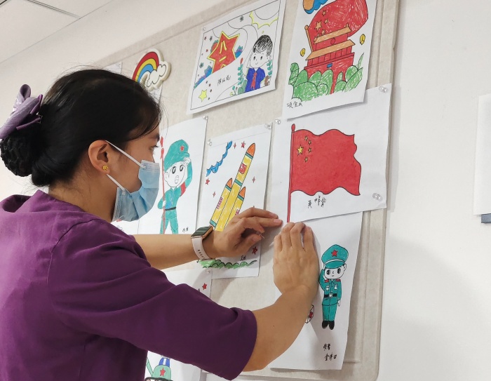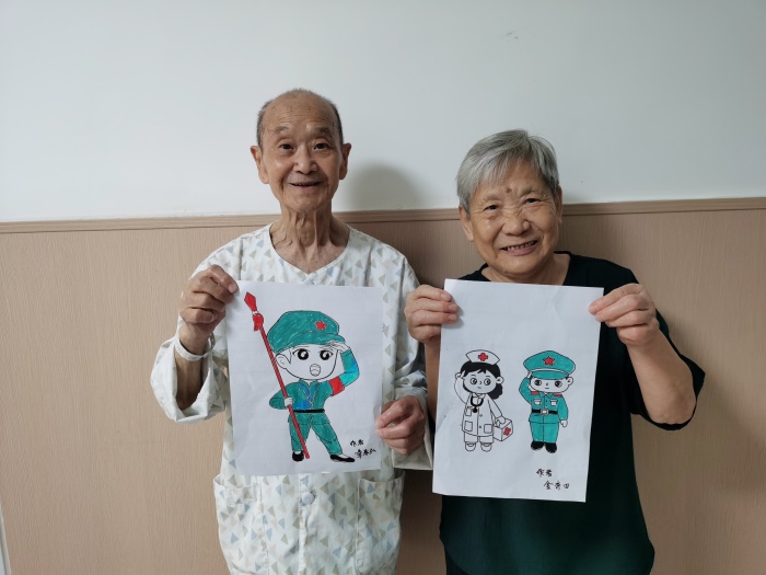 活動還設置了創(chuàng)意涂鴉環(huán)節(jié),老兵們在醫(yī)護人員的陪伴下,用五顏六色的畫筆描繪出他們心中的國旗、天安門、軍人還有鮮花等等,用另一種方式慶祝自己的節(jié)日,表達對軍旅生涯的懷念和對當下生活的熱愛。