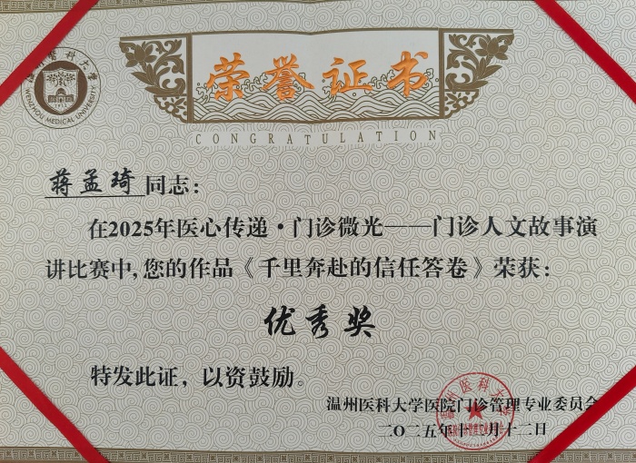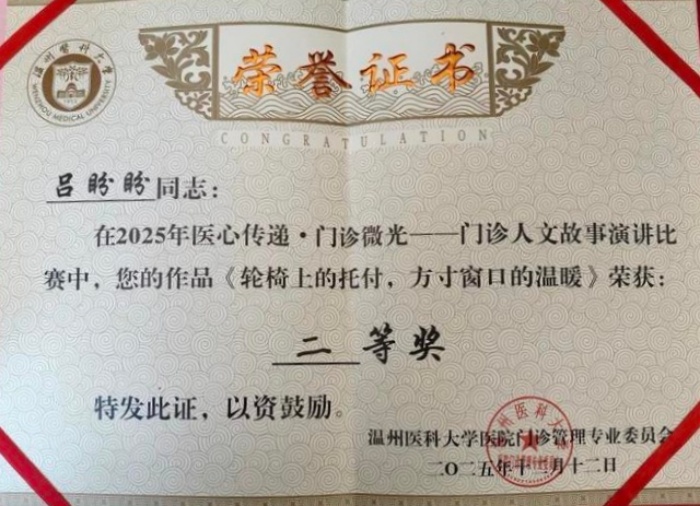 近日,由溫州醫(yī)科大學(xué)門診管理專業(yè)委員會(huì)主辦的門診人文故事演講比賽順利落幕。我院門診部護(hù)士呂盼盼、疼痛科護(hù)士蔣孟琦憑借真實(shí)的醫(yī)患故事與真摯表達(dá),從33個(gè)參賽作品中脫穎而出,分別榮獲二等獎(jiǎng)與優(yōu)秀獎(jiǎng),充分展現(xiàn)了我院人文護(hù)理建設(shè)的扎實(shí)成效與醫(yī)療服務(wù)的溫度。