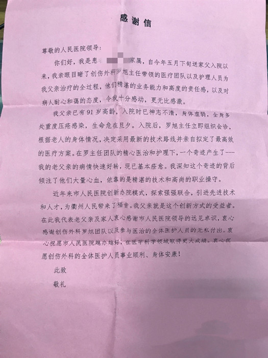 “你們精湛的業(yè)務(wù)能力和高度的責(zé)任感以及對(duì)病人耐心和藹的態(tài)度,令我十分感動(dòng),更無(wú)比感激……”姚老先生的家屬特地寫了一封感謝信,為我院和羅旭主任帶領(lǐng)的醫(yī)護(hù)團(tuán)隊(duì)點(diǎn)贊。