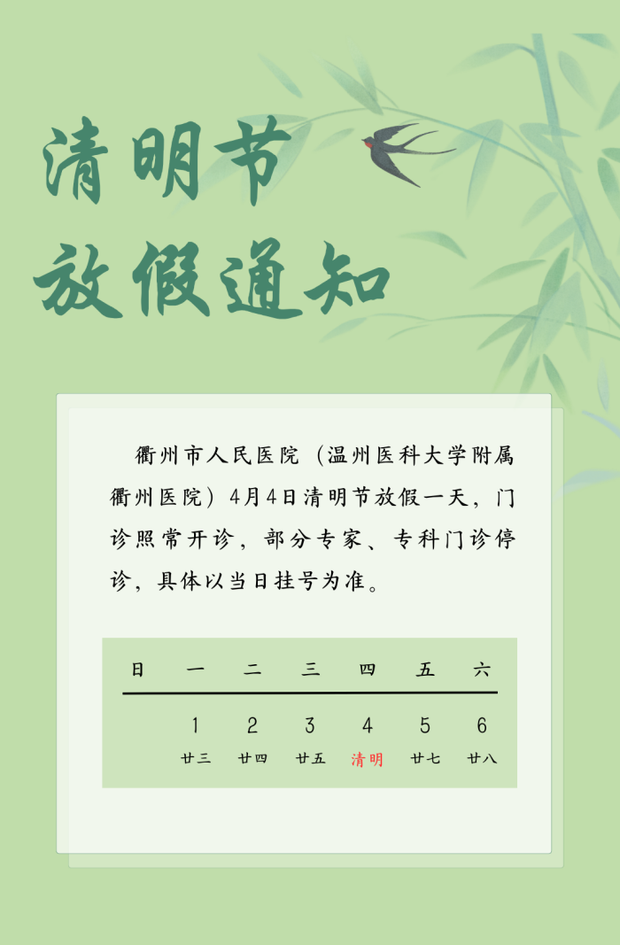 我院2024年清明節(jié)門診安排 文章來源:門診部 作者: 點擊數(shù):2057 更新時間:2024-04-03 上一篇: 五一放“價”,摘鏡出游約一波~~ 下一篇: 衢州首站!“健康浙里行——走基層、惠民生”媒體采風活動走進我院