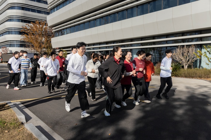 “預(yù)備——跑!” 指令響起,研究生們身著統(tǒng)一白色文化衫,胸前“健康同行?聚力成長” 字樣格外醒目。他們分批邁著輕快步伐出發(fā),白色身影躍動前行,宛如流動的青春風(fēng)景線。